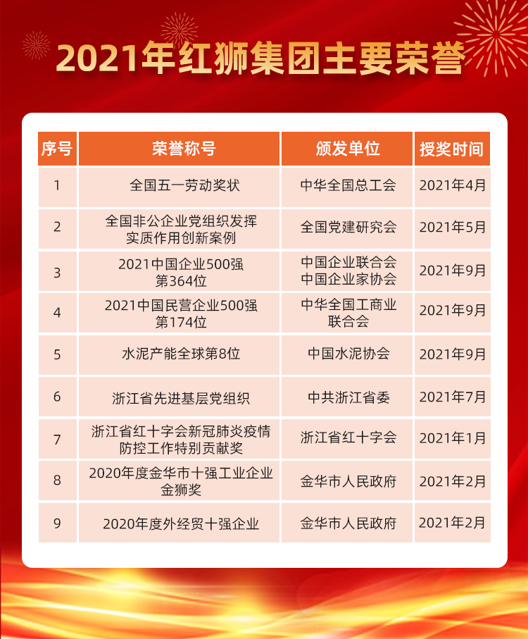 紅獅集團排名2021中國民營企業(yè)500強第174位、中國民營企業(yè)制造業(yè)500強第92位,連續(xù)九年入圍中國民營企業(yè)500強榜單,也是繼入圍2021中國企業(yè)500強(第364位)、中國制造業(yè)企業(yè)500強(第171位)后的又一殊榮。