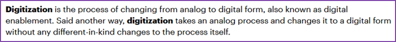 數(shù)字化的概念起源于歐美。1995年,美國(guó)麻省理工學(xué)院教授尼葛洛龐蒂的《數(shù)字化生存》一書(shū),宣布以“比特”為存在物的數(shù)字化時(shí)代的到來(lái)。數(shù)字化是指使用0和1兩位數(shù)字編碼來(lái)表達(dá)和傳輸一切信息的一種綜合性技術(shù),即將電話、電報(bào)、數(shù)據(jù)、圖像等各種信息都變成數(shù)字信號(hào)。數(shù)字化相關(guān)的英文有Digitization和Digitalization。全球知名IT咨詢公司Gartner對(duì)Digitization和Digitalization的解釋分別是: