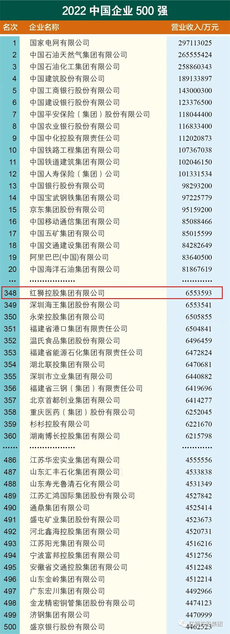紅獅集團(tuán)位列2022中國企業(yè)500強(qiáng)第348位、中國民營企業(yè)500強(qiáng)第154位