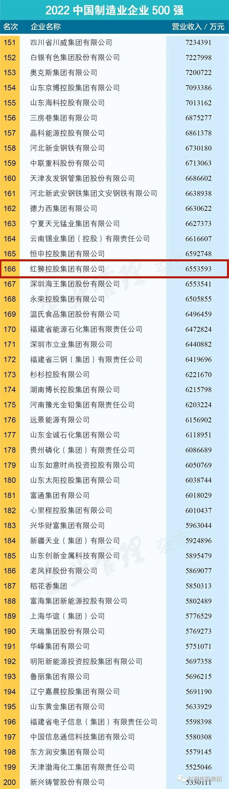 9月6日上午,中國企業(yè)聯(lián)合會(huì)、中國企業(yè)家協(xié)會(huì)(簡稱中國企聯(lián))在京舉辦新聞發(fā)布會(huì),向社會(huì)發(fā)布了“2022中國企業(yè)500強(qiáng)”“2022中國制造業(yè)企業(yè)500強(qiáng)”等榜單。紅獅集團(tuán)位列2022中國企業(yè)500強(qiáng)第348位、中國制造業(yè)企業(yè)500強(qiáng)第166位。