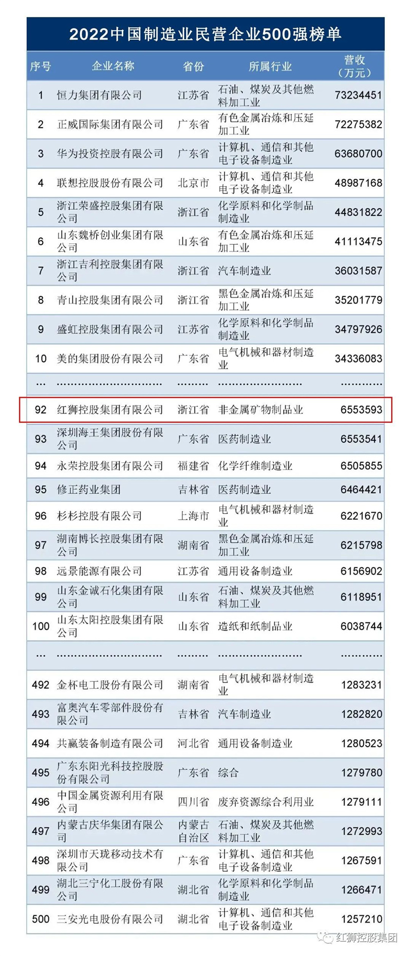 9月7日,全國工商聯(lián)發(fā)布2022中國民營企業(yè)500強(qiáng)、中國制造業(yè)民營企業(yè)500強(qiáng)榜單,紅獅集團(tuán)重回其在中國民營企業(yè)500強(qiáng)榜單的歷史最好成績,第154位,列中國制造業(yè)民營企業(yè)500強(qiáng)92位,營收一年時(shí)間猛增105億元,達(dá)655.4億元。紅獅用兩年時(shí)間,從500億大關(guān)突破600億大關(guān),再次展示了其雄厚實(shí)力。