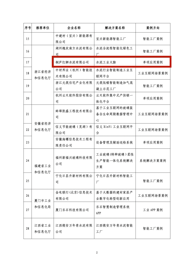 桐廬紅獅“水泥工業(yè)大腦項(xiàng)目”入選國家工信部發(fā)布的建材工業(yè)智能制造數(shù)字轉(zhuǎn)型典型案例