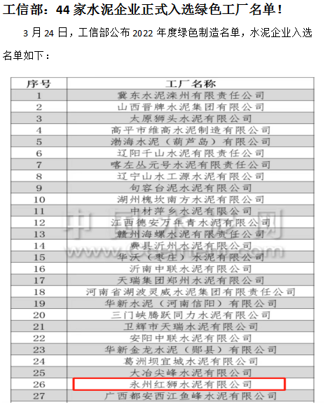 3月24日,國家工業(yè)和信息化部下發(fā)《關(guān)于公布2022年度綠色制造名單的通知》,44家水泥企業(yè)入選“綠色工廠”名單,永州紅獅為其中之一。