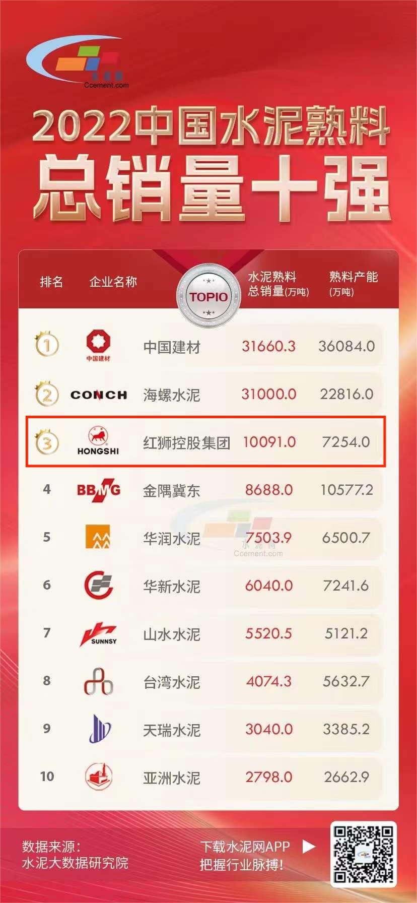 近日,中國水泥網(wǎng)水泥大數(shù)據(jù)研究院發(fā)布2022中國水泥熟料總銷量十強榜單,紅獅集團以總銷量10091萬噸位居第三。