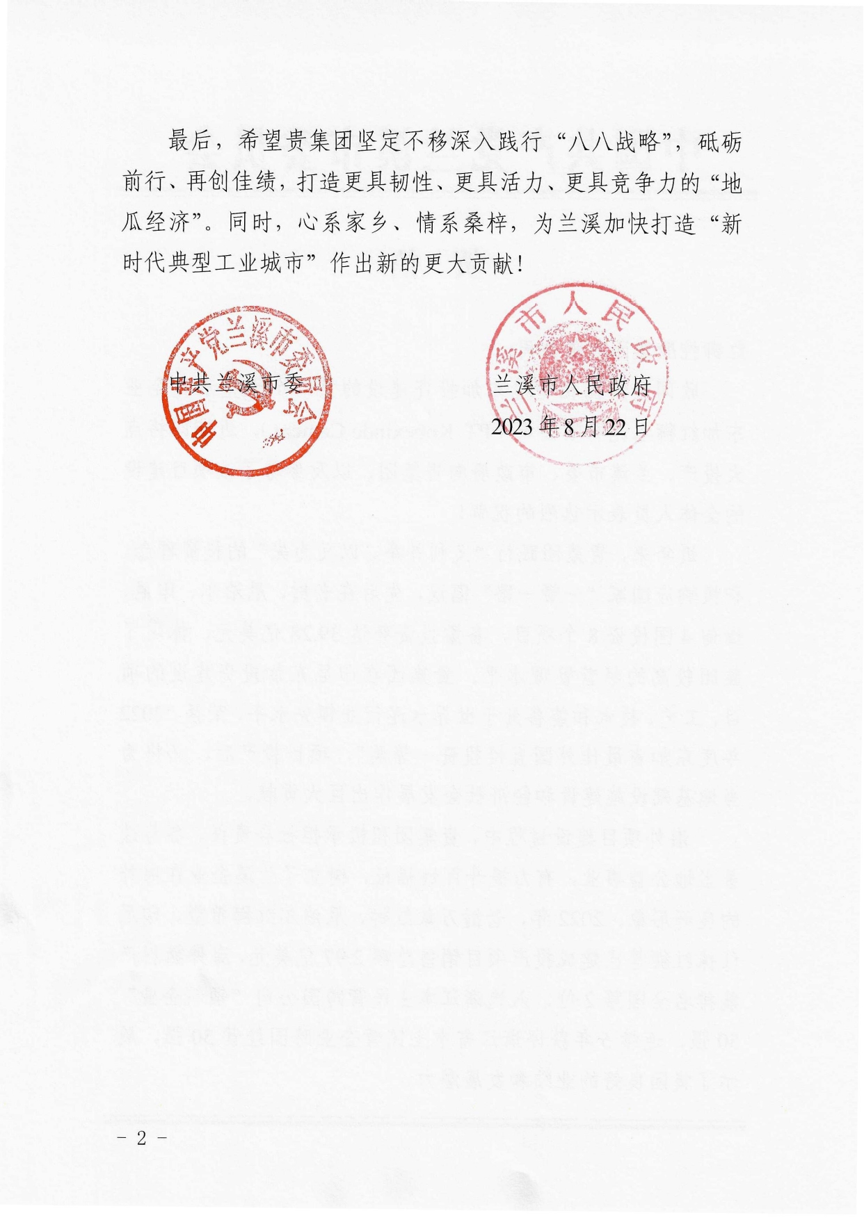 集團(tuán)總部所在地蘭溪市委市政府特地發(fā)來賀信,稱贊紅獅集團(tuán)“義利并舉、以義為先”的投資理念,積極承擔(dān)社會(huì)責(zé)任,參與改善當(dāng)?shù)毓媸聵I(yè),有力提升百姓福祉,樹立了蘭溪企業(yè)在海外的良好形象。同時(shí)鼓勵(lì)集團(tuán)堅(jiān)定不移深入踐行“八八戰(zhàn)略”,打造更具韌性、更具活力、更具競爭力的“地瓜經(jīng)濟(jì)”,心系家鄉(xiāng)、情系桑梓,為蘭溪加快打造“新時(shí)代典型工業(yè)城市”作出新的更大貢獻(xiàn)!