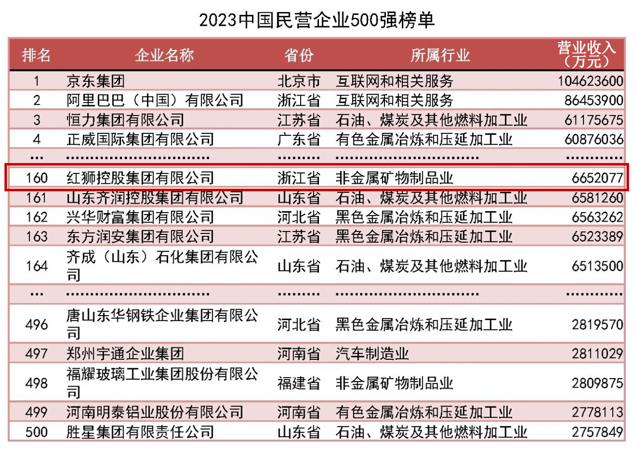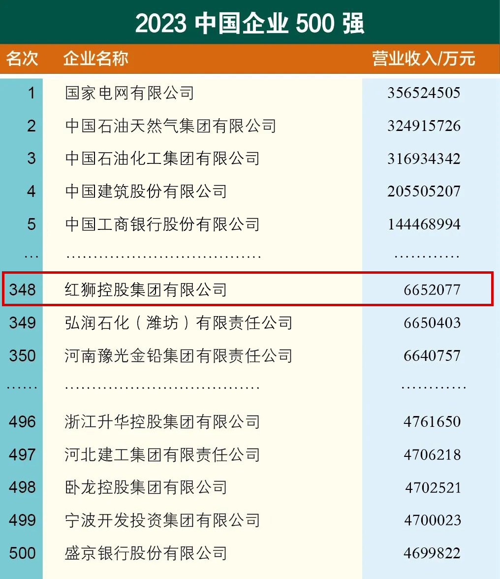 紅獅集團(tuán)位列2023中國企業(yè)500強第348位、中國民營企業(yè)500強第160位