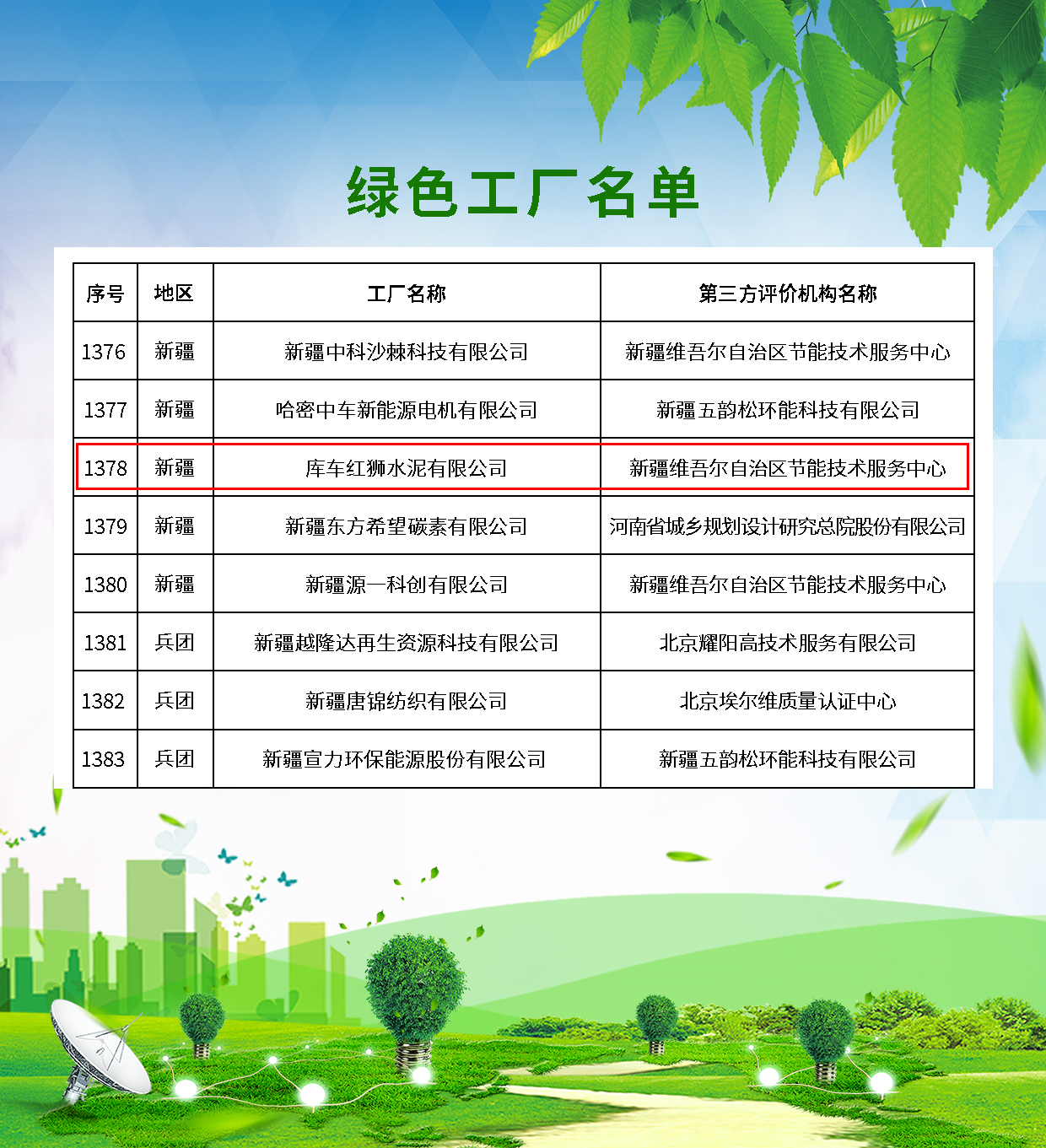 1月5日,工業(yè)和信息化部辦公廳下發(fā)《工信廳節(jié)函〔2023〕384號 工業(yè)和信息化部辦公廳關(guān)于公布2023年度綠色制造名單及試點(diǎn)推行“企業(yè)綠碼”有關(guān)事項的通知》,公布2023年度“國家級綠色工廠"名單,庫車紅獅水泥有限公司上榜。