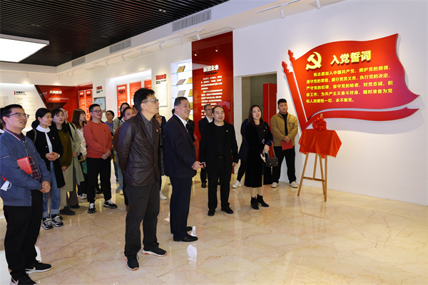 “二十大”精神宣講會前,集團(tuán)副總經(jīng)理楊志清、黨委副書記許如華陪同與會領(lǐng)導(dǎo)在大廳一樓觀看宣傳片、參觀集團(tuán)展廳、黨建展廳、控制中心、座談交流,紅獅集團(tuán)黨委第一支部書記許如華與行政學(xué)院設(shè)計藝術(shù)學(xué)院教工黨支部書記夏盛品共同為黨建聯(lián)建揭牌。