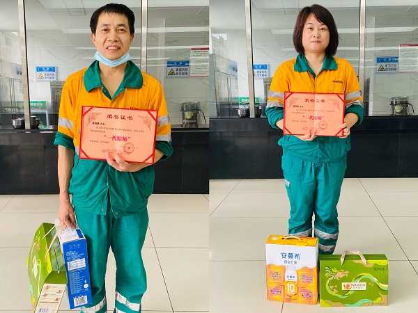 夠?qū)嵙?,才敢與“粽”不同。比賽原計劃時限為十分鐘,但經(jīng)過激烈的角逐,不到十分鐘就風(fēng)卷云殘,一粒米都不剩,桌面堆滿了風(fēng)格各異的粽子。由圍觀群眾共同組成“粽情組”將包好的粽子進(jìn)行收取,對粽子大小適中、均勻,四角不露餡、捆扎整齊、不松線、個數(shù)等進(jìn)行綜合評比,最終設(shè)備科連良超、財務(wù)科田秀珠包得又好又快又多,贏得圍觀群眾嘖嘖稱贊,毫無懸念分別榮獲了男組、女組的“一代粽師”稱號,頒發(fā)榮譽(yù)證書一本、精美獎品一份。獨樂樂不如“粽”樂樂,公司也貼心地為其余參與比賽的粽師們準(zhǔn)備了禮物;大家收獲了獎品,更收獲了快樂。