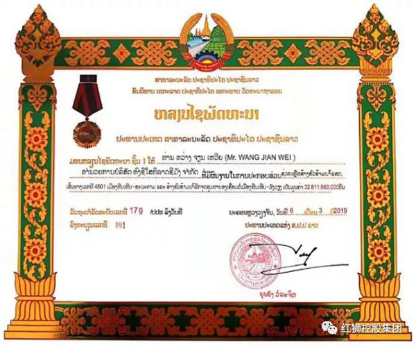 由老撾國(guó)家主席簽發(fā)的“國(guó)家一級(jí)發(fā)展勛章”證書