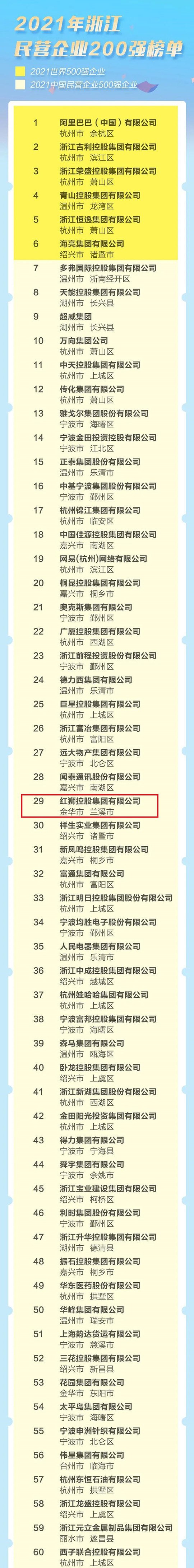 紅獅集團列2021浙江民營企業(yè)200強第29位