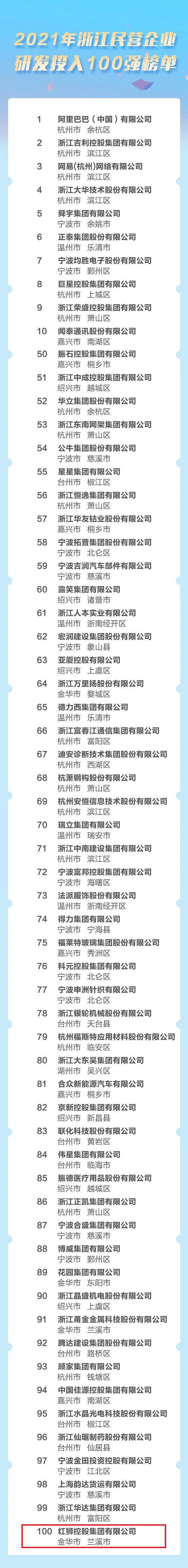 紅獅集團分別列2021浙江民營企業(yè)200強第29位、研發(fā)投入100強第100位、就業(yè)100強第54位。
