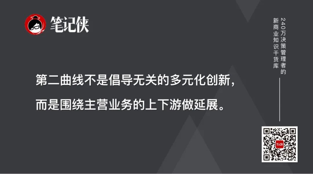 所以,第二曲線不是倡導(dǎo)無關(guān)的多元化創(chuàng)新,而是圍繞主營業(yè)務(wù)的上下游做延展。