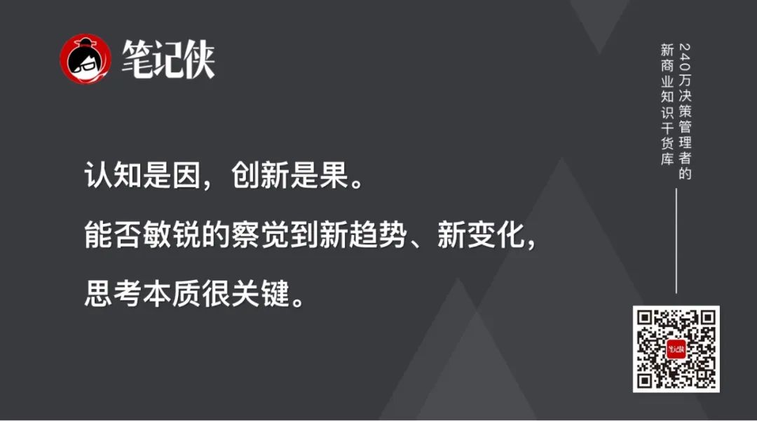 所以,認(rèn)知是因,創(chuàng)新是果。能否敏銳的察覺到新趨勢、新變化,思考本質(zhì)很關(guān)鍵。想要?jiǎng)?chuàng)新,根本方法是認(rèn)知升級(jí)。